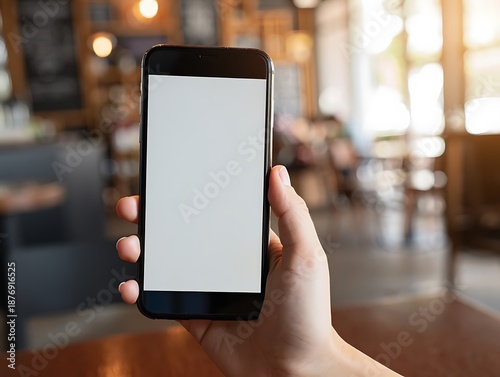 hand, smartphone, blank, screen, cafes, person, mobile, device, technology, communication, indoor, hot drink, shop, eatery, wooden, table, blurred, background, finger, holding, contraption, modern, phone