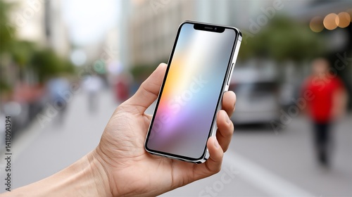 Hand holding smartphone with colorful screen over blurred street background