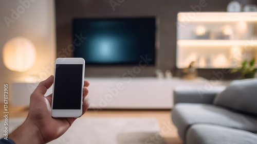 Hand holding smartphone with smart TV in modern living room