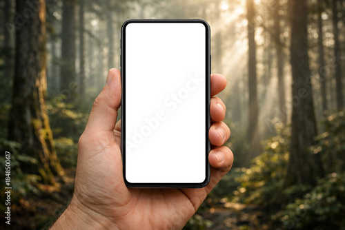 smartphone, hand, blank screen, forest, mobile, phone, holding, screen, nature, display, wood, empty, white, mobile phone, wood, green, sunlight, digital, communication, device, technology, cyberspace, wireless, connection, landscape, electronic, isolated, copy space, blurred, bokeh, sun ray, morning, adventure, environment, hiking