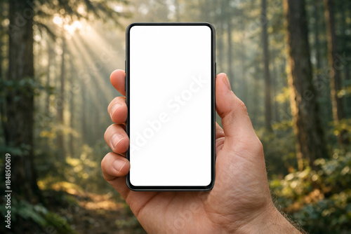 smartphone, hand, blank screen, forest, mobile, phone, holding, screen, nature, display, wood, empty, white, mobile phone, wood, green, sunlight, digital, communication, device, technology, cyberspace, wireless, connection, landscape, electronic, isolated, copy space, blurred, bokeh, sun ray, morning, adventure, environment, hiking
