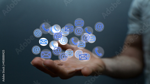Hand holding using mobile phone with email icon on screen. Concept of business communication