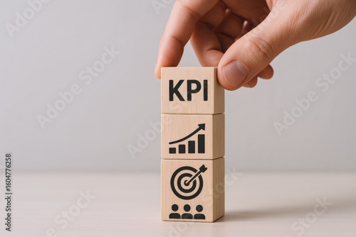 Hand holding wooden blocks with KPIs and growth chart icons representing business performance and success measures on a plain background