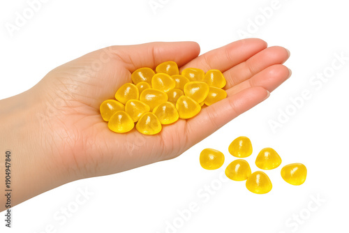 Hand holding yellow gummy vitamins, supplements promoting health, wellness, and daily nutrition, transparent background
