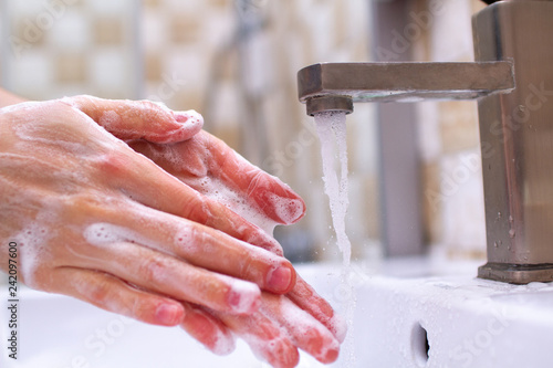 Hand hygiene. Person in the bathroom is cleaning and washing hands using soap foam