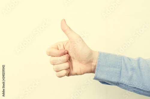 symbol, thumb, signs, white, communication, female, arm, hand, finger, agreements, 1, background, success, caucasian, idea, concept, number, gesticulate, business, index, person, first, part, up, ok, like, palm, screen, point, blue, shirt, toned