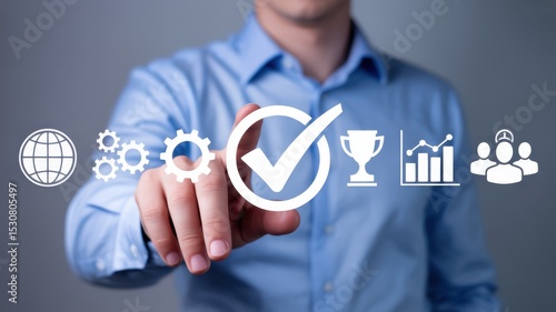 approval, hand, management, technology, globe, touch screen, accomplishment, planning, light, modern, growth, teamwork, virtual, check, business, interactive, digital, graph, success, trophy, interface, solution, optimization, people, progress, interaction, light blue, blue, efficiency, strategy, businessperson, white, icon, gear, analysis, development
