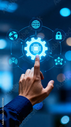 Hand interacting with a digital interface displaying technology icons including a gear, globe, lock, and network symbols.
