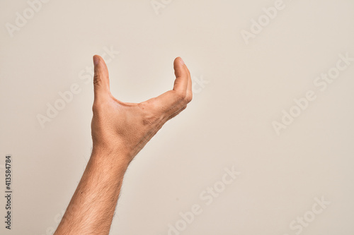 Hand of caucasian young man showing fingers over isolated white background picking and taking invisible thing, holding object with fingers showing space