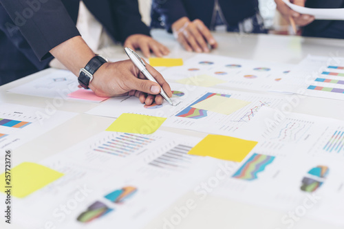 hand of marketing manager employee pointing at business document during discussion at meeting room - Business concept