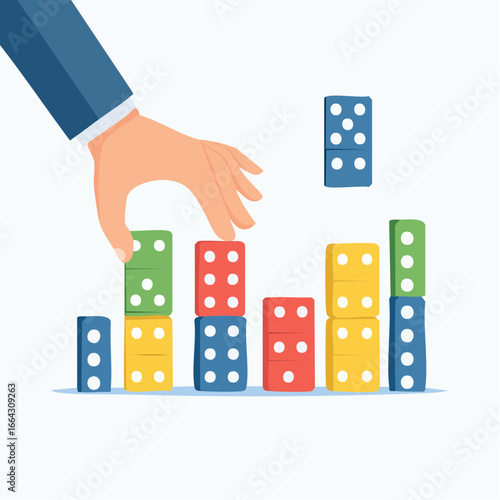 hand, domino, colourful, building, business, strategy, planning, stacked, cube, block, graphic, illustration, design, domino, game, stack, learning, growth, process, step, blue, green, yellow, red, effect, visual, flat, simple, pattern, cartoon, animation, education