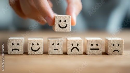 Hand placing smiley face block for positive construction building happiness with cheerful block positive construction project