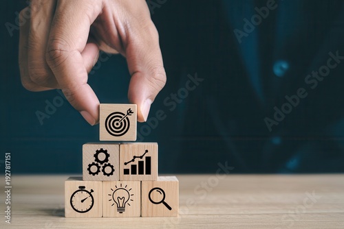 Hand placing target icon wooden block on business concept stack