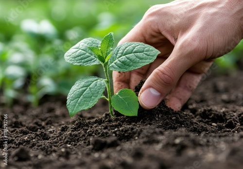 Hand Planting Young Seedling in Soil, Nurturing Growth of Green Plant in Organic Garden, Sustainable Agriculture and Environmental Protection Concept