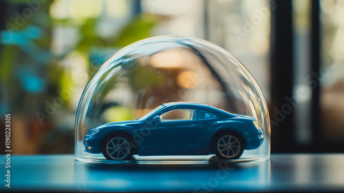 Hand protect blue toy car under a glass dome in concept car care, insurance, and repair coverage covered automobile for financial security.