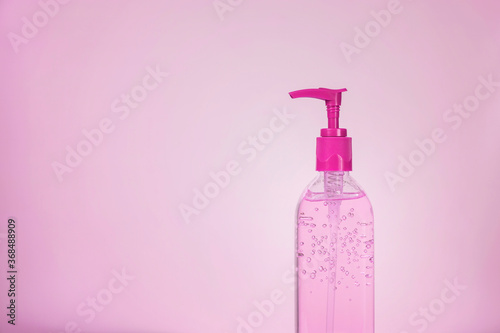 Hand sanitizer in pink bottle on bright pink background