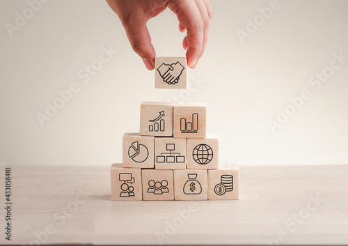 Hand stack woods block step on table with icon business strategy and Action plan. business investment and development concept.