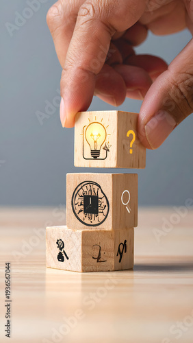 hand, block, wooden, stacking, idea, light bulb, question, mark, icon, symbol, creativity, innovation, solution, problem, solving, concept, strategy, thinking, brainstorming, development, growth, learning, education, progress, success, leadership, management, future, opportunity, challenge, decision, making, improvement, potential, resource, analysis, planning, organisation, research, discovery, imagination, curiosity, insight, exploration, perspective, vision, intelligence, cognition, wisdom