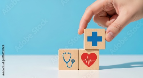 Hand stacking wooden blocks with icons of a stethoscope, heart rhythm, and a blue cross, representing healthcare
