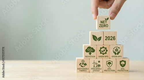 Hand stacking wooden blocks with Net Zero 2026 and eco icons for sustainability