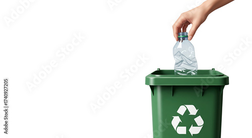 Hand Throwing Plastic Bottle into Green Recycling Bin Isolated on White Background