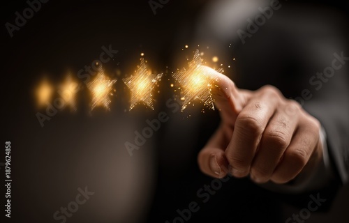 hand, star, rating, feedback, review, glow, point, touch, digital, technology, business, success, concept, evaluation, choice, option, life events, positive, quality, service, client, achievement, performance, goal, target, excellence, gold, luxury, elegant, professional, expertise, innovation, award, recognition, reward, connection, interface, interaction, support, opinion, satisfaction, vote, like, best, top, 5, light, sparkle, shiny