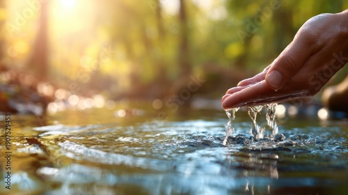 water, hand, stream, forest, nature, ripple, clear, touch, serene, calmness, sunlight, liquid, fresh, environment, outdoors, clean, purity, calm, peace, zen, wellness, health, natural, flowing, motion, surface, texture, detail, closeup, scene, landscape, daylight, bright, sunshine, sparkle, glimmer, blur, bokeh, relax, refresh, element, resource, conservation, ecology, flora, foliage, green, tree