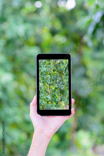 Hand with a smart phone taking photo of green trees.