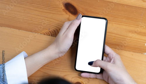 hand woman using a telephone, empty screen smart phone and computer on wooden table top view.