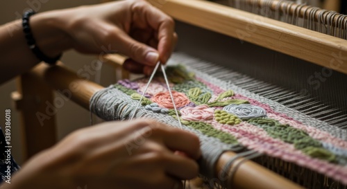 Handcrafted Floral Tapestry Weaving - Close-up of hands skillfully weaving a floral tapestry on a wooden loom. Delicate pastel colors and intricate details
