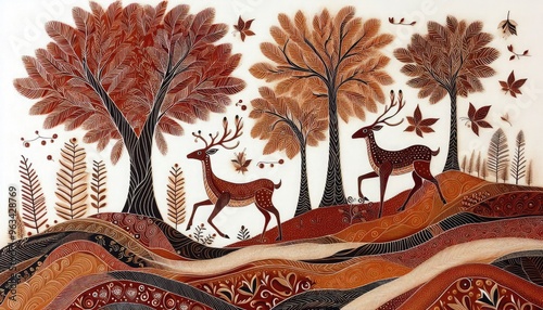 Handcrafted Gond art featuring graceful deer and vibrant trees, depicted in rich earthy tones against a stark white background