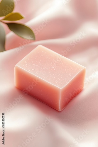 Handcrafted natural soap bar on soft pink fabric, top view. Minimalist aesthetic, beauty product