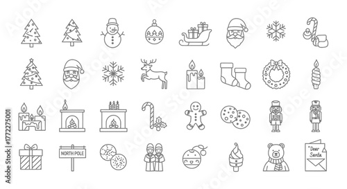Hand-Drawn Christmas Icon Set – Tree, Santa, Gifts, Wreath, Reindeer, Snowman, Holiday Doodles