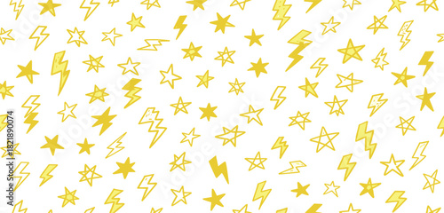 Hand-drawn seamless pattern of golden stars and lightning bolts, a whimsical doodle background symbolizing celestial energy and magic