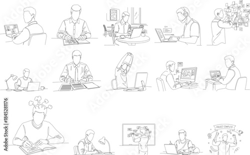 people, desk, office, work, illustration, hand-drawn, line, thin, set, diverse, employee, workspace, men at work, business, job, computer, sitting, table, occupation, vignetting, drawing, doodle, outline, character, design, graphic, artistic, creativity, teamwork, co-worker, collaboration, professional, male, female, person, education, learning, study, conference, presentation, communication, meeting, brainstorm, corporate