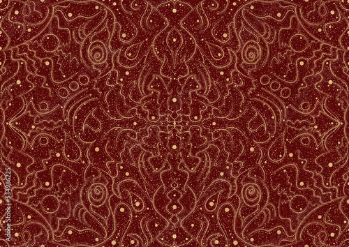 Hand-drawn unique abstract symmetrical seamless gold ornament and splatters of golden glitter on a deep red background. Paper texture. Digital artwork, A4. (pattern: p07-2a)