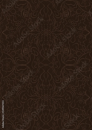Hand-drawn unique abstract symmetrical seamless ornament. Light semi transparent brown on a dark brown background. Paper texture. Digital artwork, A4. (pattern: p07-1d)