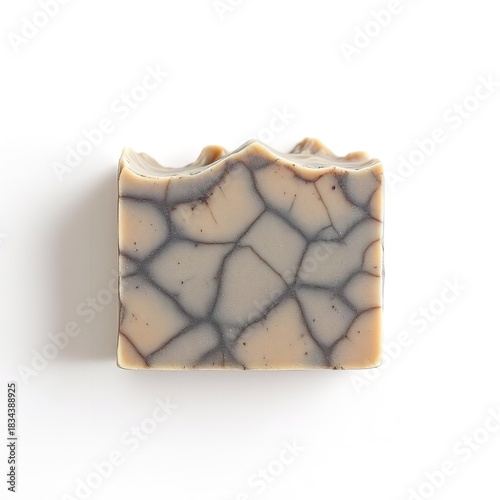 Handmade natural soap bar with cracked earth pattern in beige and gray color isolated on white background