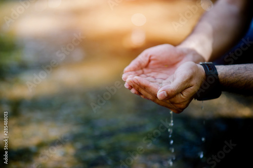 Hands and water flowing from natural waterfalls Water concept from natural waterfall