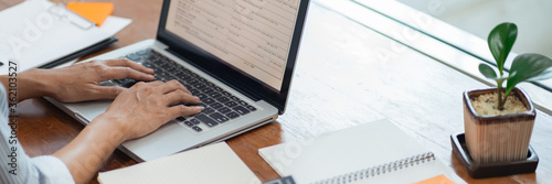 hands close up Freelancer busy working on a laptop computer on desktop.