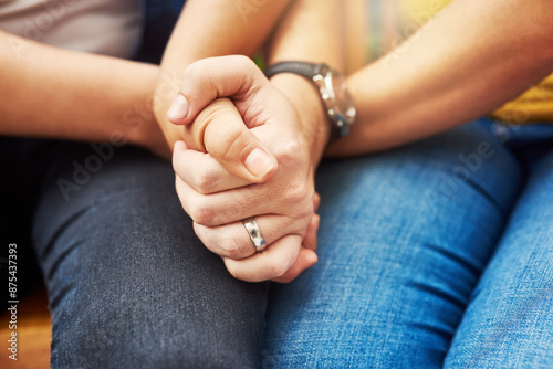 Hands, couple and support in counselling, closeup and love for comfort and communication for relationship. Marriage, prayer and worship for emotion and religious people, respect and unity for grief