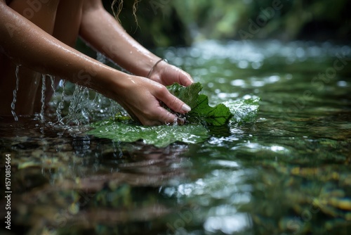 Hands gently holding a green leaf while submerged in a clear stream of water