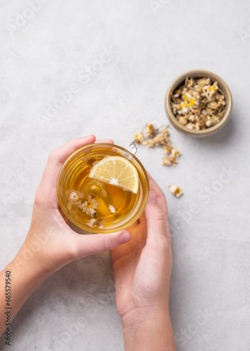 Hands holding a glass cup with chamomile herbal tea on a light background with dry flowers. The concept of a healthy drink for health and immunity.