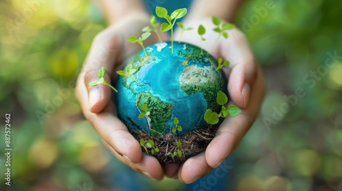hands holding a globe with sprouting plants, symbolizing environmental care, Environmental realistic