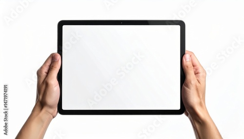 Hands holding a modern tablet with blank white screen for mockup and advertising in a bright studio setting, showcasing technology and connectivity