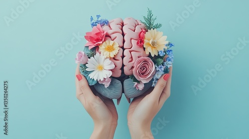 Hands holding a paper head with a human brain made of flowers, symbolizing self-care, mental health, and positive thinking.