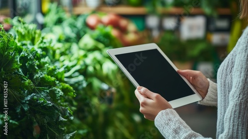 hand, tablet, shopping, eco, vegetable, market, fresh, green, healthy, technology, sustainable, consumer, food, grocery, produce, natural, lifestyle, urban, closeup, wellness, activity, digital, information, nature, modern, interaction, environment, choice, organic, screen, vegan, engagement, receipe, bright, cheerful, showcase, convenience, preparation, seller