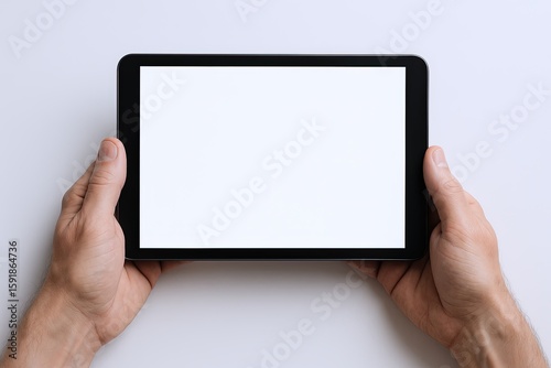 Hands Holding Black Tablet Computer with White Screen on Light Gray Surface.