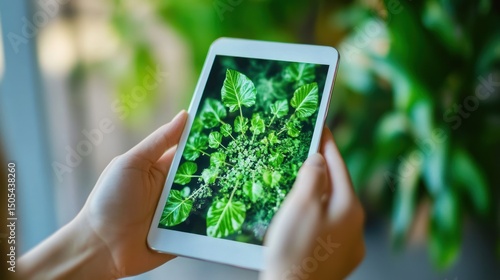 Hands holding tablet, plant image