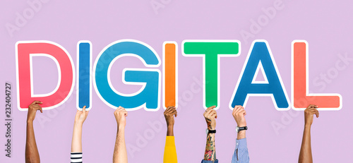 Hands holding up colorful letters forming the word digital